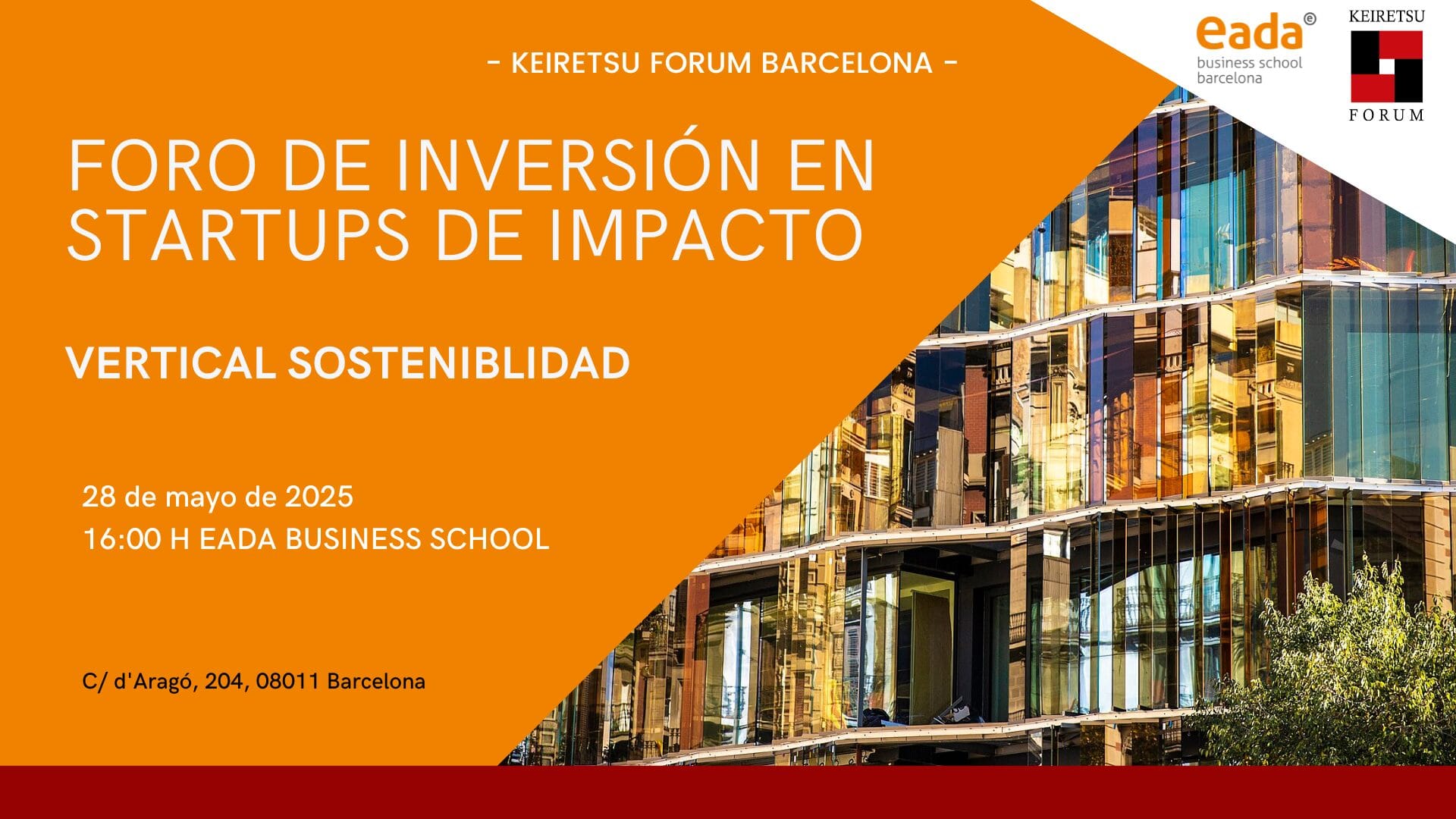 El 28 de mayo de 2026 (16:00h) celebraremos el Foro de Inversión Keiretsu Forum en colaboración con EADA Business School, en sus instalaciones situadas en calle d’Aragó, 204 en Barcelona. Fundada en 1957, EADA es una escuela de negocios internacional con más de seis décadas de experiencia en formación directiva y desarrollo empresarial, reconocida por su enfoque práctico y su compromiso con la formación de líderes responsables y sostenibles. La institución destaca por integrar la sostenibilidad y el impacto social en sus programas y actividades formativas.